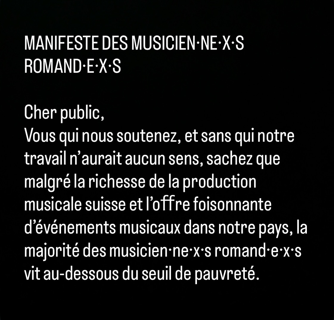 Avec ses lettres blanches sur fond noir, le Manifeste des musicien.ne.x.s romand.e.x.s est apparu très sobre sur les réseaux il y a une maintenant une dizaine de jours. Or, son contenu a quelque chose du cri, pour faire voir une réalité que vivent de nombreux artistes actifs dans les musiques actuelles. La centaine de signataire réclame « une augmentation des fonds publics pour les musiques actuelles, ainsi que l’élaboration, en partenariat avec les autorités et autres acteur.ices.x.s du milieu, d’un modèle viable et équitable pour tou.te.x.s ».